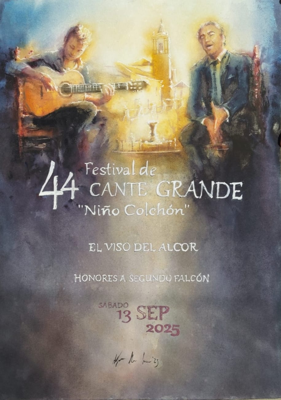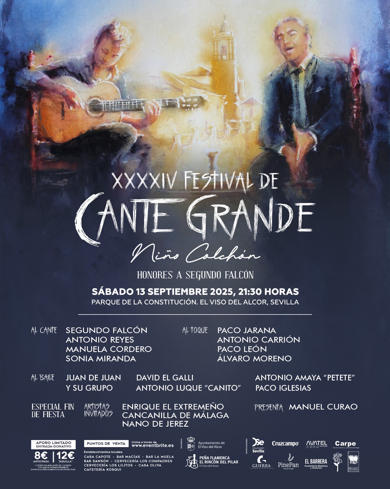 El resto de extraordinarios artistas que conforman el cartel son: Enrique El Extremeño, Cancanilla de Málaga, Nano de Jerez, Paco Jarana, Antonio Carrión, Paco León y Álvaro Moreno.La presentación del acto correrá a cargo del periodista de Canal Sur Manuel Curao y rendirá honores a la figura de D. Segundo Falcón.El autor del cartel ha sido Alfonso Martín Morales, joven artista visueño especializado en acuarela contemporánea.A tan solo 15 minutos de Sevilla capital, este festival se ha convertido en una de las citas flamencas de referencia.El Festival se celebra en un precioso marco de fácil acceso y bajo el manto de un pueblo acogedor y rico en gastronomía situado en el corazón de la comarca de Los Alcores.La organización hace extensiva la invitación a todos los aficionados para que puedan sumarse al disfrute de esta cita tan especial.Consolidada como una de las grandes citas del panorama flamenco comarcal, el Festival de Cante Grande de El Viso del Alcor sigue cada año promocionando el flamenco como una de las señas de identidad características de nuestra tierra, haciéndolo atractivo y accesible para los amantes y entendidos del flamenco, pero sin olvidar al público en general.