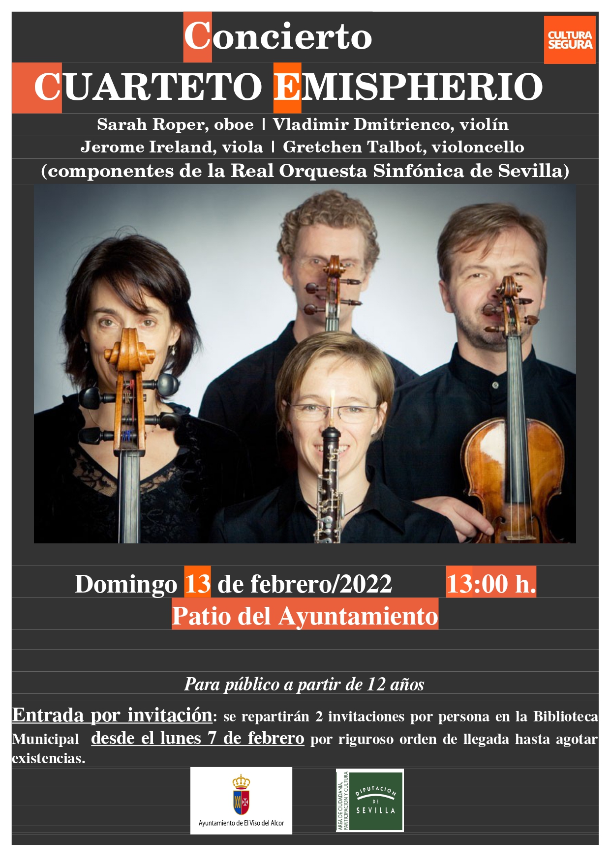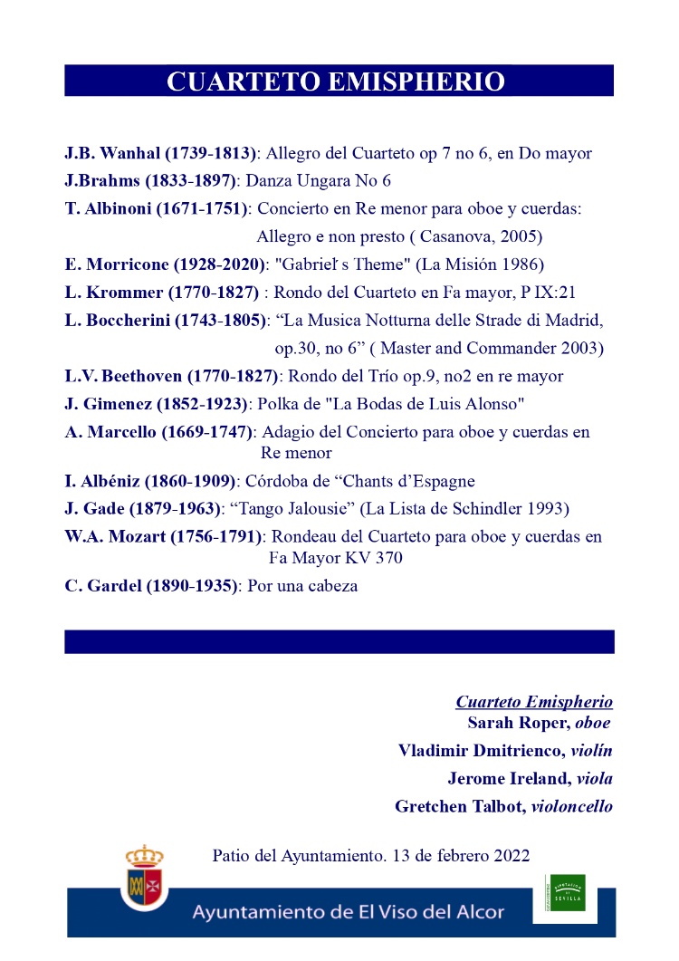 La Delegación de Cultura del Ayuntamiento de El Viso del Alcor organiza, en colaboración con la Diputación de Sevilla, el concierto del cuarteto Emispherio, compuesto por Sarah Roper, oboe; Vladimir Dmitrienco, violín; Jerome Ireland, viola y Gretchen Talbot, violoncello. Componentes de la Real Orquesta Sinfónica de Sevilla.