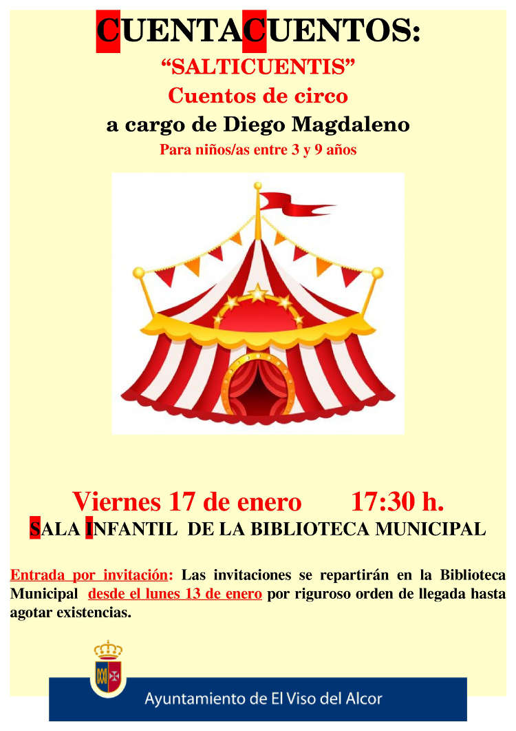 La Delegación de Cultura del Ayuntamiento organiza una nueva sesión de Cuentacuentos a cargo de Diego Magdaleno, el VIERNES 17 DE ENERO A LAS 17:30 H. EN LA SALA INFANTIL DE LA BIBLIOTECA MUNICIPAL. En esta ocasión el cuentista Diego Magdaleno presenta “Salticuentis”, cuentos de circo y está destinado a niños y niñas de entre 3 y 9 años.