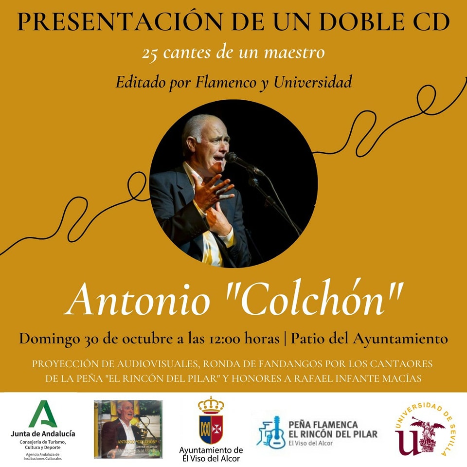 El Ayuntamiento de El Viso del Alcor, a través de la Delegación de Cultura, informa que el Consistorio acogerá el 30 de octubre a partir de las 12:00 horas la presentación del disco homenaje a Antonio Colchón, “25 cantes de un maestro”. El Delegado, Carlos Rodríguez, declara que “se trata de un evento donde se hablará de flamenco y se pondrá en valor la figura del cantaor visueño a través de un doble CD homenaje que está editado por Flamenco y Universidad. Un disco del que ha sido parte fundamental la labor de Segundo Falcón, asesor del Instituto Andaluz de Flamenco”.