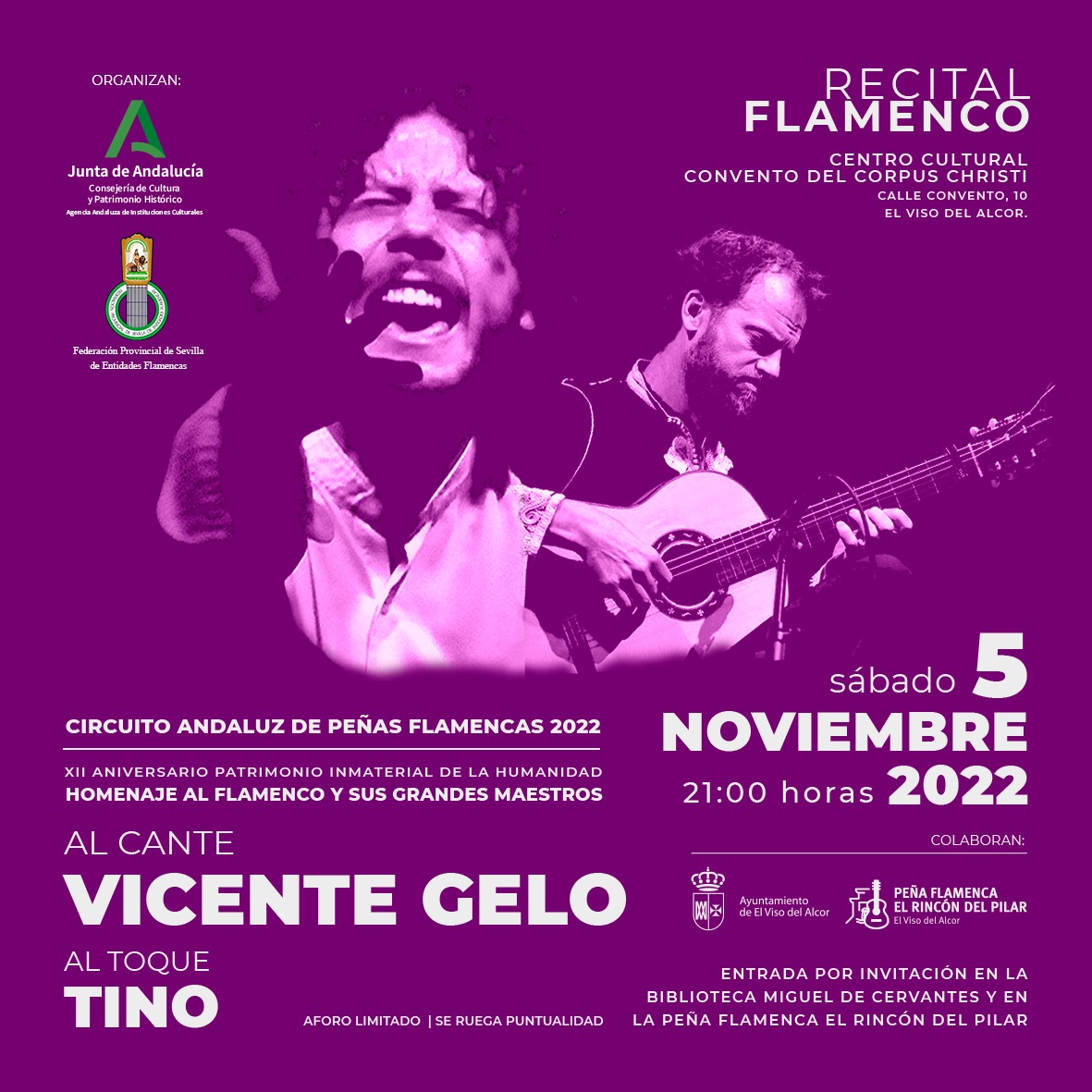 El Ayuntamiento de El Viso del Alcor, a través de la Delegación de Cultura, y la Peña Flamenca El Rincón del Pilar organizan dos recitales para conmemorar el Día Internacional del Flamenco dentro del Circuito Andaluz de Peñas Flamencas, la cual celebra el XII Aniversario del Flamenco como Patrimonio Inmaterial de la Humanidad. El Delegado, Carlos Rodríguez, explica que los recitales serán los sábados 5 y 26 de noviembre en el Centro Cultural Convento del Corpus Christi a las 21:00 horas.