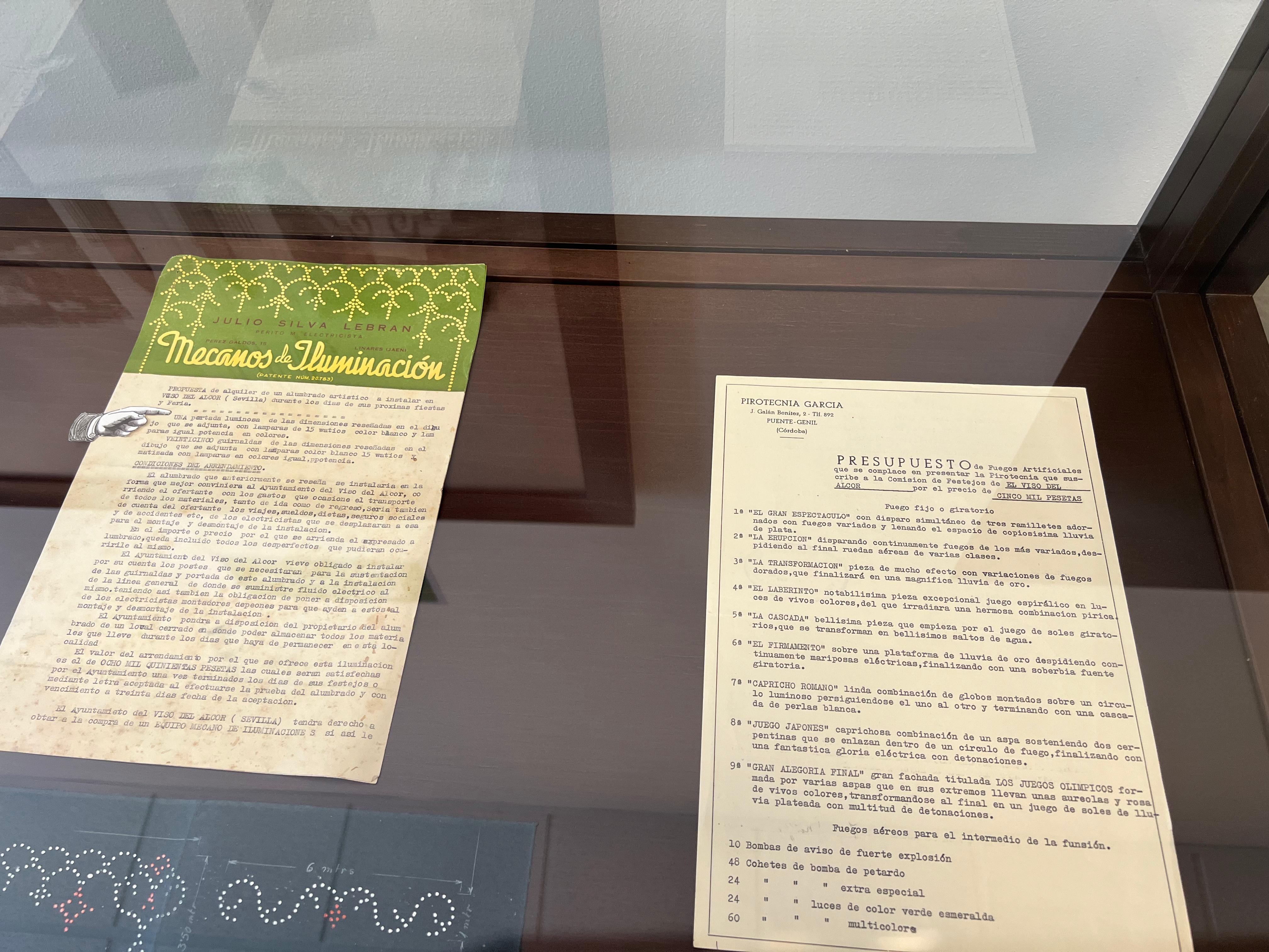 Y por último, encontramos documentación referente a los contratos de iluminación artística, así como de la contratación de un castillo de fuegos artificiales para la celebración de las dichas fiestas. Es característico como se nos añade incluso el diseño que tendrían esos arcos de luces que se instalarían en nuestro pueblo llegado el mes de Mayo.