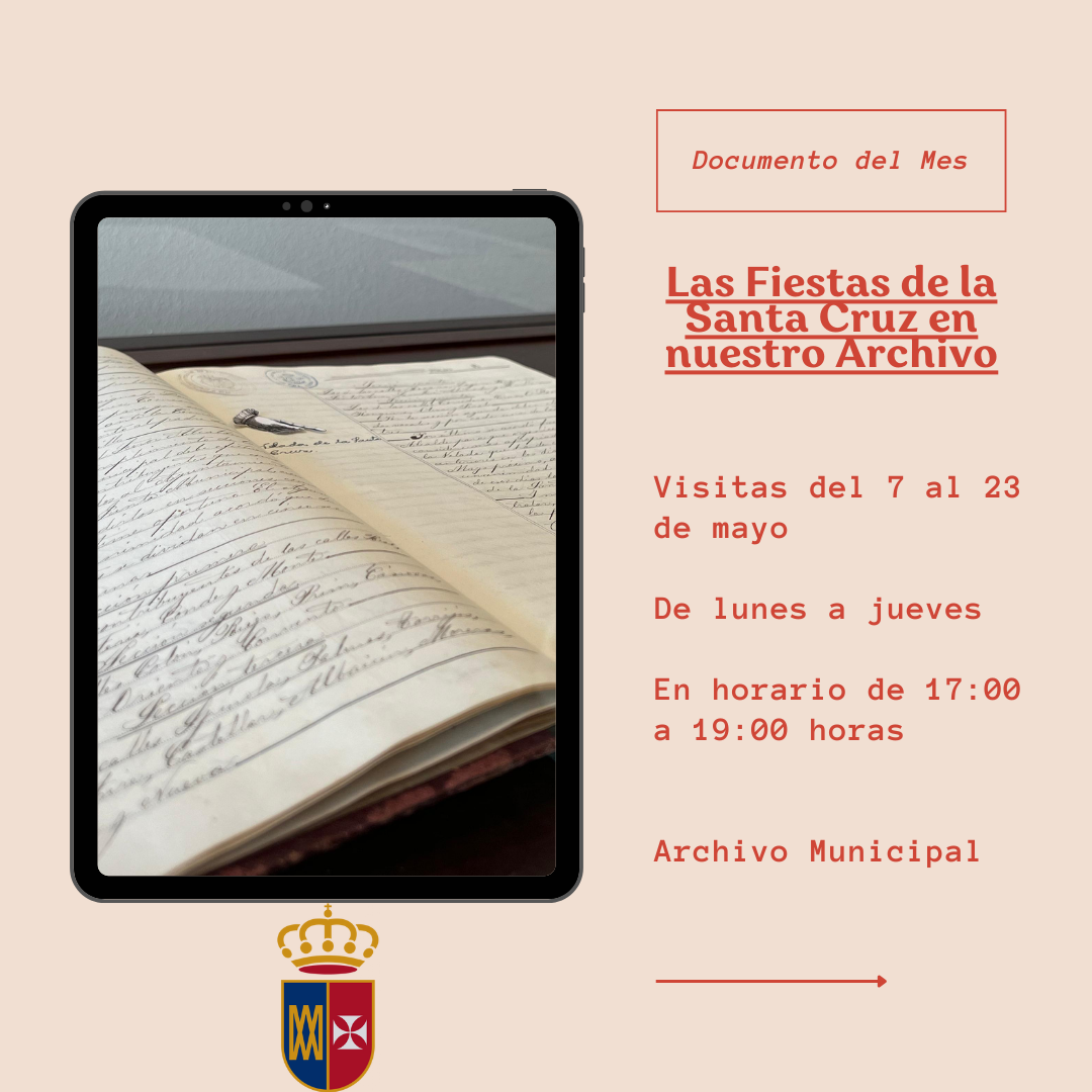 Continuamos en esta bonita tarea para seguir conociendo nuestro patrimonio histórico documental con la actividad del Documento del Mes. Para esta ocasión y en vísperas de nuestras tan arraigadas Fiestas de la Santa Cruz, traemos una documentación que relaciona estrechamente a nuestro Ayuntamiento con dicha festividad. Se podrá visitar el Archivo Municipal del 7 al 23 de mayo, de lunes a jueves en horario de 17:00 a 19:00 horas.