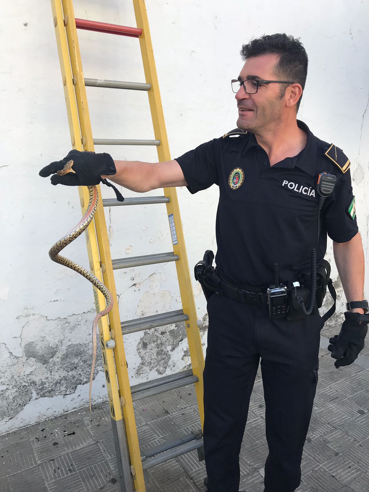 Ha sido sobre las 10,00 horas del martes 19 de junio cuando han llamado vecinos de la conocida calle El Monte, calle Manuel Jiménez León, alertando de la presencia de dicho animal entre unos cables. Personados, así lo confirman unos operarios de cable que trabajaban en la fachada y se han topado con ella, aunque estaba ya enroscada tras los cables. Por ello ha habido que insistir en que saliera del lugar a fin de no tirar de la misma y hacerle daño, siendo bastante escurridiza y defendiéndose.