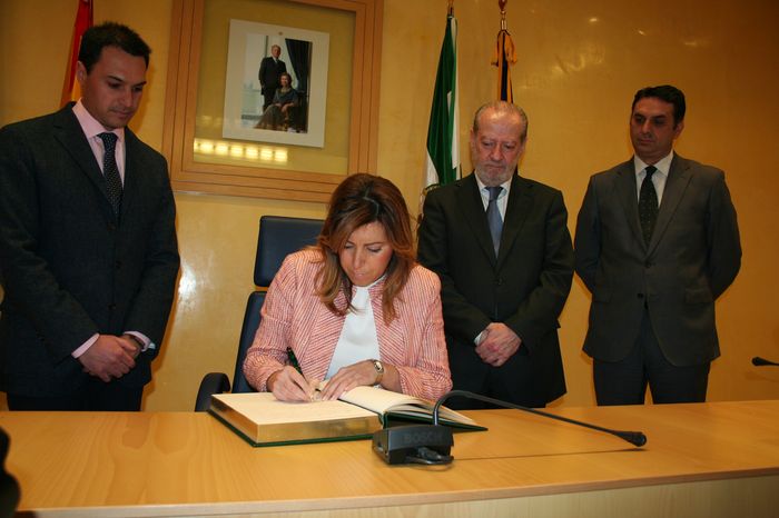 La Presidenta, junto al Presidente de la Diputación de Sevilla, Fernando Rodríguez Villalobos, y el Delegado del Gobierno de la Junta de Andalucía en Sevilla, Francisco Javier Hernández, ha sido recibida por el Alcalde y miembros de la Corporación Municipal en el Salón de Plenos donde ha procedido a firmar en el Libro de Honor del Ayuntamiento.