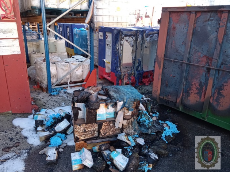 Por parte del policía se le indica que desaloje a los trabajadores, así como que abran la cancela, dado que ya se había alertado a los agentes de la Policía Local de servicio y a los bomberos, y estaban al llegar. En la zona inmediata al fuego había apilados tanques de productos tóxicos y peligrosos, así como también existía un tanque vertical de gas. Afortunadamente, con la llegada rápida de cuatro dotaciones de bomberos, se consiguió parar el fuego y que alcanzara las zonas sensibles.