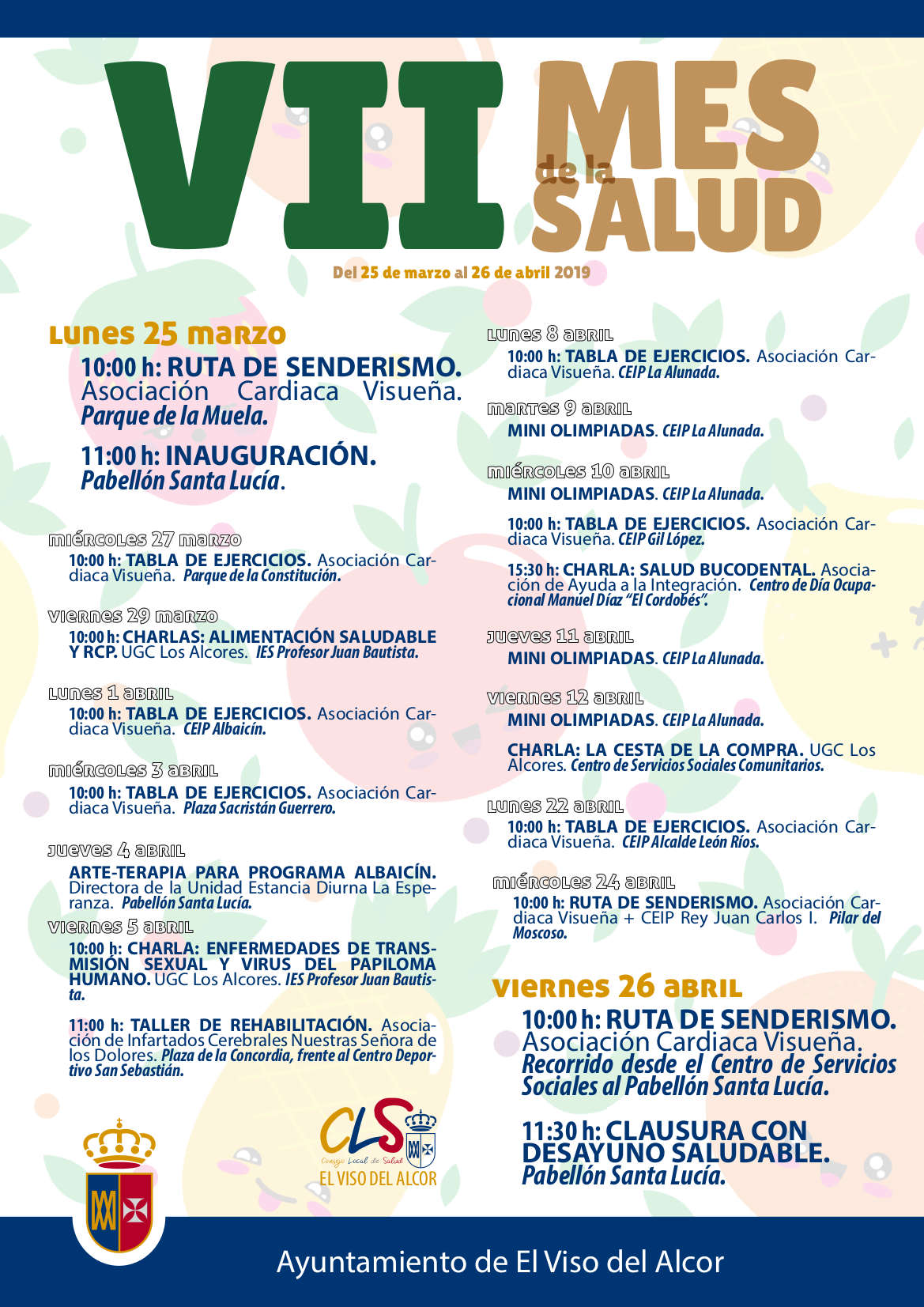 En el Colegio Gil López habrá una tabla de ejercicios a cargo de la Asociación Cardíaca Visueña. A las 15.30 una charla sobre salud bucodental en el Centro de Día Ocupacional Manuel Díaz ‘El Cordobés’. El viernes se cierra las jornadas con una charla sobre la cesta de la compra en el Centro de Servicios Sociales Comunitarios.