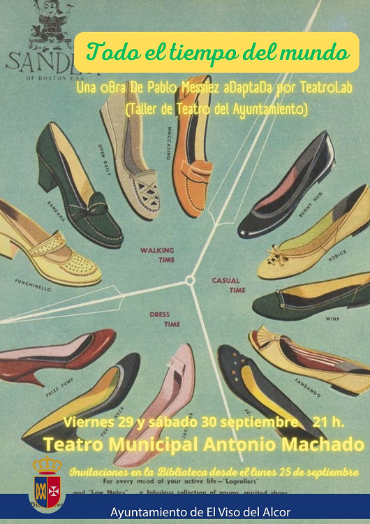 El Ayuntamiento de El Viso del Alcor, a través de la Delegación de Cultura, informa de las representaciones del taller de teatro del Ayuntamiento “TeatroLab”, que pondrá en escena una adaptación de la obra “Todo el tiempo del mundo” de Pablo Messiez, adaptación que ha sido realizada por el propio grupo de teatro bajo la dirección de Edi Carrascal. El Delegado de Cultura, Francisco José Soto, explica que las funciones tendrán lugar el viernes 29 y sábado 30 de septiembre a las 21:00 horas el Teatro Municipal Antonio Machado.