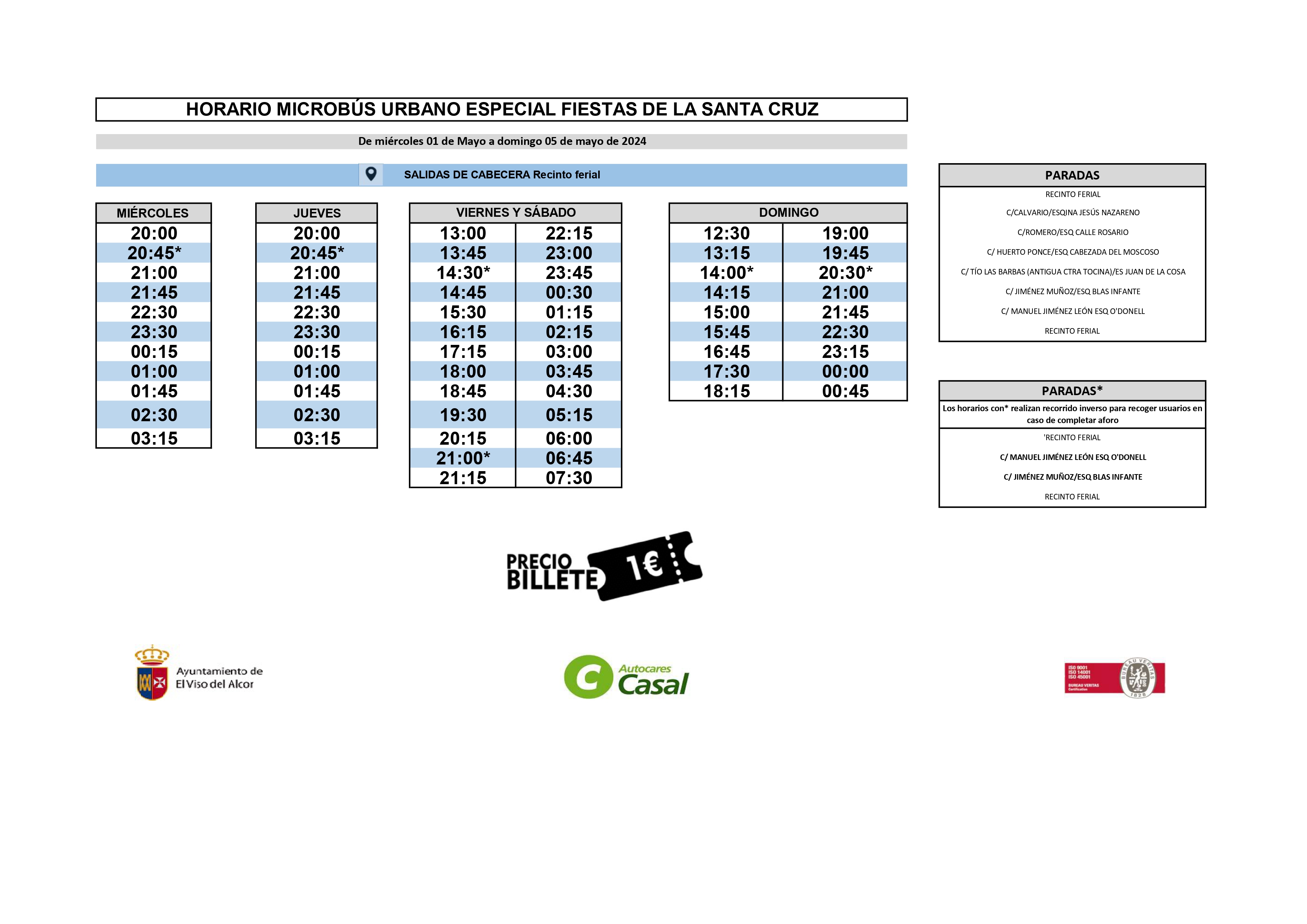 El Ayuntamiento de El Viso del Alcor, a través de la Delegación de Fiestas, anuncia que un año más se pondrá a disposición de la ciudadanía un autobús y un microbús durante las Fiestas de la Santa Cruz. La Delegada de Fiestas, Gracia Miranda, explica que el billete tendrá un precio de un euro e irá destinado a la Residencia de Mayores San Pedro Nolasco. El autobús de 55 plazas hará de lanzadera por toda la travesía del municipio y el microbús recorrerá los barrios periféricos del municipio.