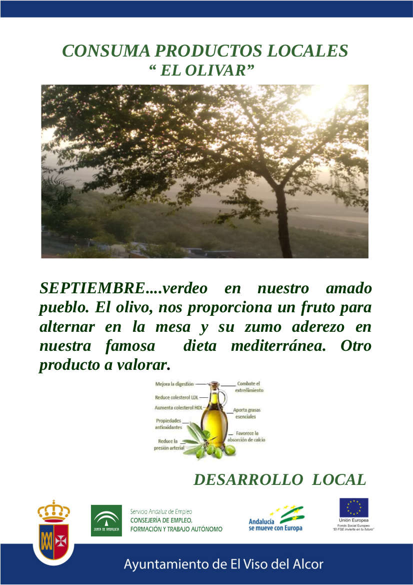 La Delegación de desarrollo del Ayuntamiento puso en marcha hace unos meses una campaña de promoción de los productos locales, así la Delegada de desarrollo, Beatriz Roldán, ha explicado que “siguiendo la línea de la Campaña puesta en marcha con el objetivo de promocionar nuestros “Productos locales”, ahora le corresponde al olivar”.