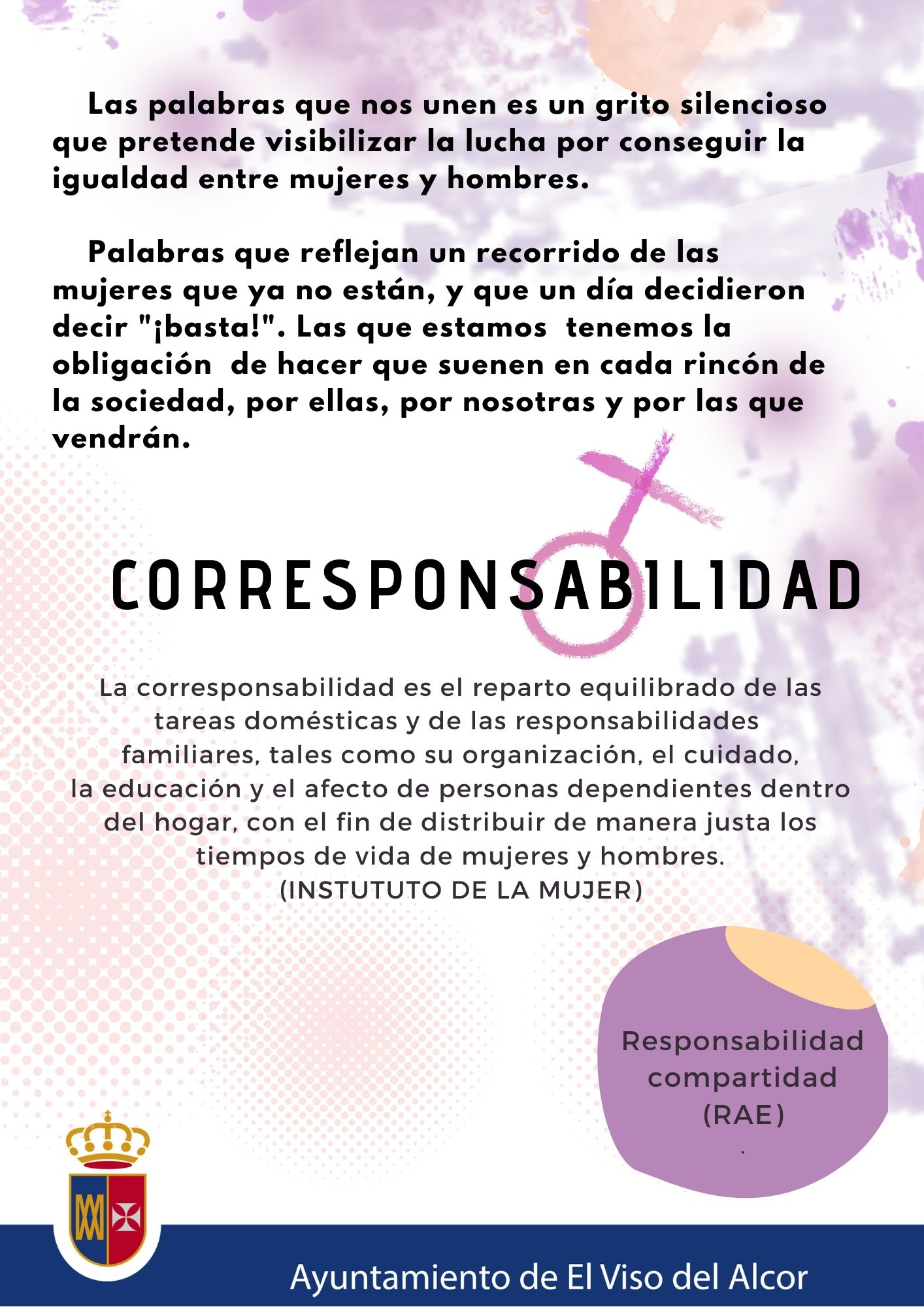 La Delegación de Igualdad del Ayuntamiento ponía en marcha “Las palabras que nos unen” una campaña enmarcada en la conmemoración del Día Internacional de la Mujer, que tiene una duración de un año, que arrancaba en marzo del pasado año, que culmina hoy y que consiste en dedicar cada mes al conocimiento de una palabra relacionada con la igualdad. “Corresponsabilidad” es la palabra con la que se cierra esta campaña que arrancaba el 8 de marzo de 2020.
