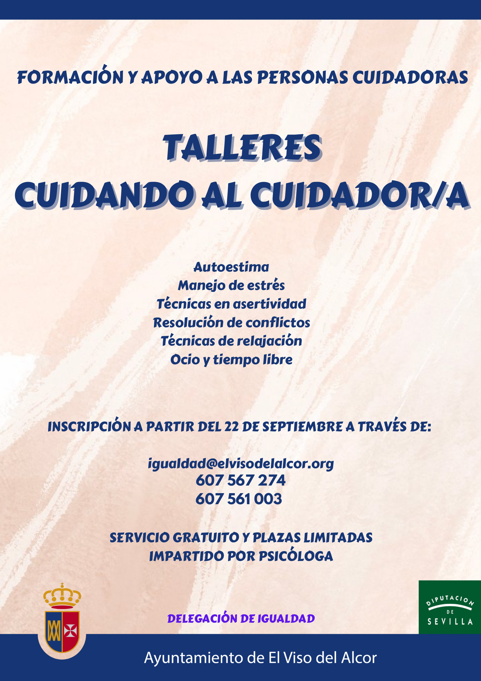 La Delegación de Igualdad pone en marcha un conjunto de TALLERES “CUIDANDO AL CUIDADOR/A “ conforme al PROGRAMA DE FORMACION Y APOYO A PERSONAS CUIDADORAS, en el marco de Programas de autonomía personal y participación de la vida comunitaria de la DIPUTACIÓN DE SEVILLA.