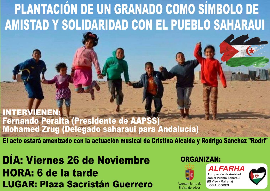 El Ayuntamiento de El Viso del Alcor y Alfarha plantarán un granado en la Plaza Sacristán Guerrero el próximo viernes a las 18:00 como símbolo de amistad y solidaridad con el pueblo saharaui. El Delegado, Carlos Rodríguez, explica que se tratará de un acto donde se descubrirá una placa de apoyo a la iniciativa solidaria de Alfarha con esta causa, "desde el Ayuntamiento no podemos hacer gran cosa en asuntos de calado internacional, pero queremos visualizar este problema para que la ciudadanía visueña tome consciencia de la situación en la que viven estas personas".
