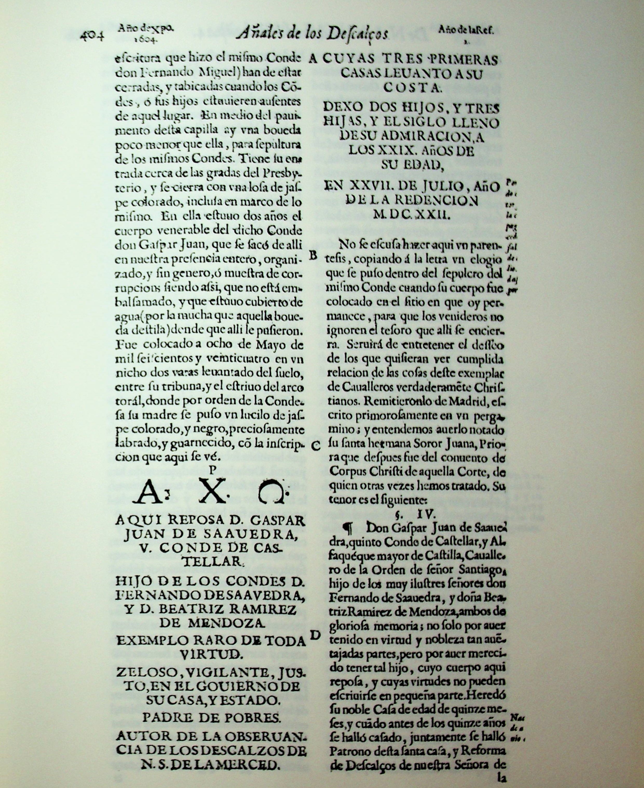 Por último, añadimos a la muestra el facsímil de los ANNALES DEL ORDEN DE DESÇALCOS DE N. S. DE LA MERCED, donde Fray Pedro de San Cecilio nos da testimonio del elogio que se encuentra junto al Conde en su sepultura. Dicha edición puede encontrarse en la Biblioteca Pública Municipal de nuestro pueblo.