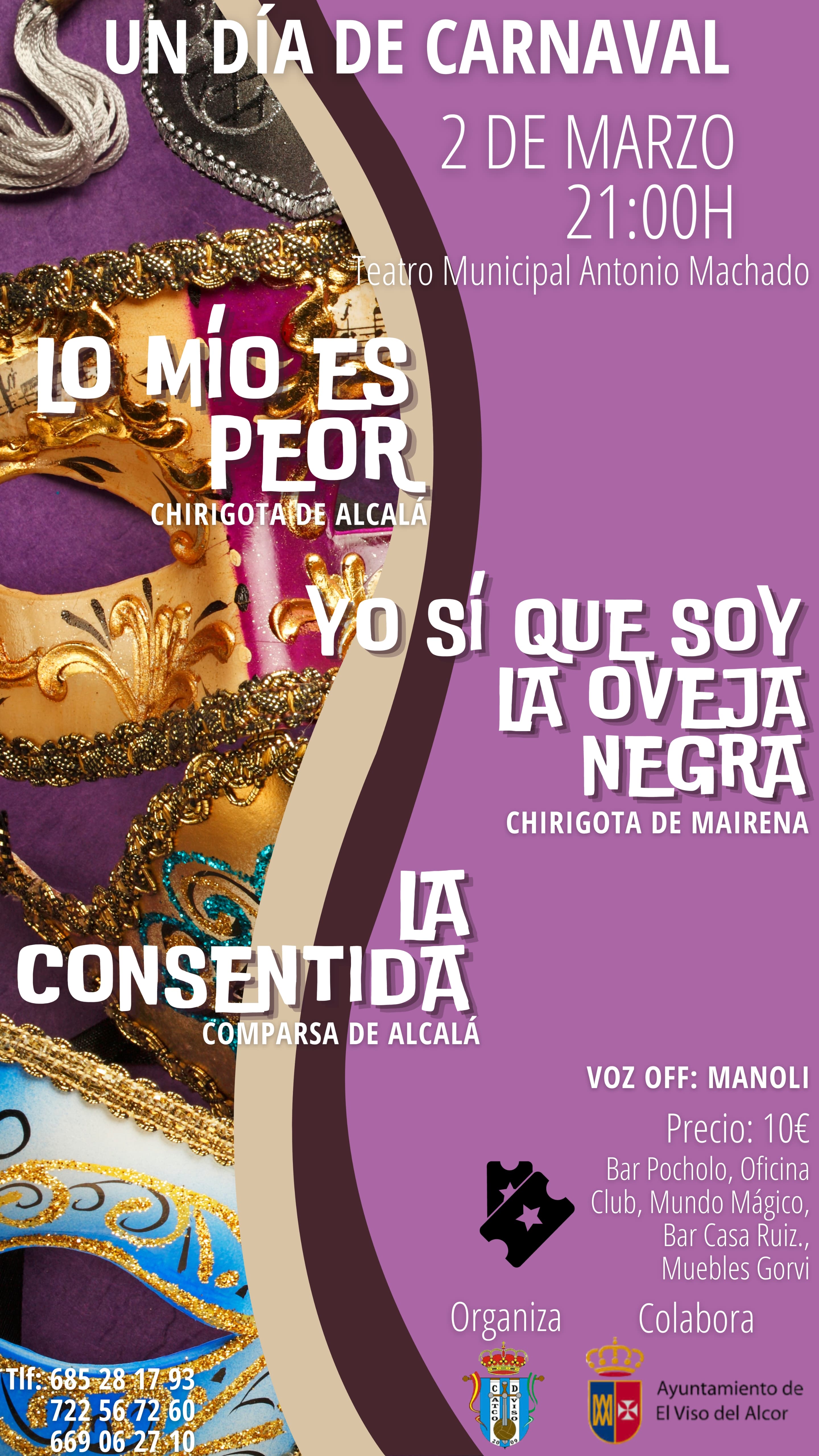 En cuando a las actuaciones, estarán presentes “Lo mío es peor” chirigota de Alcalá de Guadaíra, la cual participa en el Carnaval de Cádiz, “Yo sí que soy la oveja negra” chirigota de Mairena del Alcor y “La consentida” comparsa de Alcalá de Guadaíra. Precio de la entrada de 10 euros que podrá ser adquirida en la oficina del Club Atlético Viso, Bar Pocholo, Mundo Mágico, Bar Casa Ruiz y Muebles Gorvi.