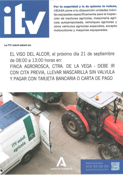 El próximo 21 de septiembre se ubicará una unidad móvil de inspección técnica de vehículos, ITV, de 08.00 a 13.00 horas, destinada a la inspección de vehículos agrícolas.