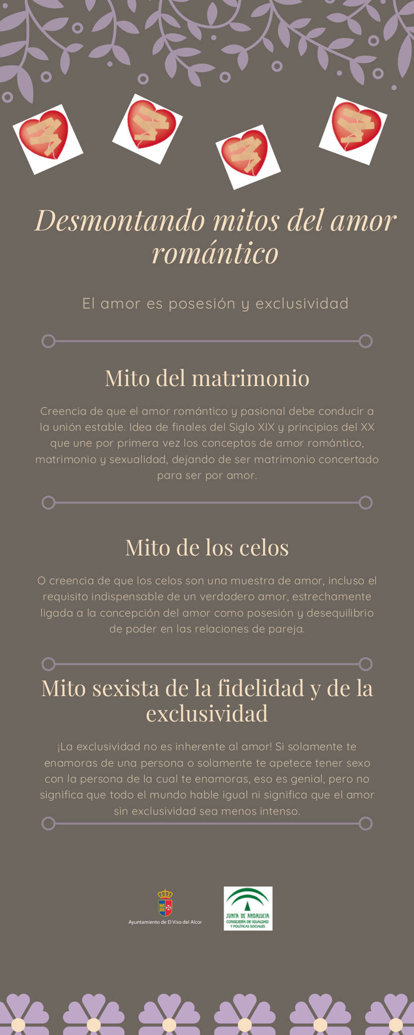 Desde la Delegación de Igualdad, como cada semana, y a través de infografías, da a conocer temas relevantes relacionados en este caso con los mitos del amor romántico y cómo desmontarlos.