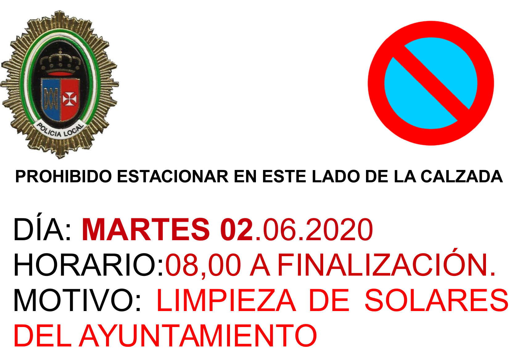 La Policía Local va a proceder, a petición de la Delegación de Servicios Generales del Ayuntamiento, a la señalización de prohibido estacionar en la bolsa de estacionamiento de las traseras de calle Hondilla para poder proceder a la limpieza de solares de titularidad municipal, trabajos que se realizarán mañana MARTES 02 DE JUNIO A PARTIR DE LAS 08,00 HORAS.