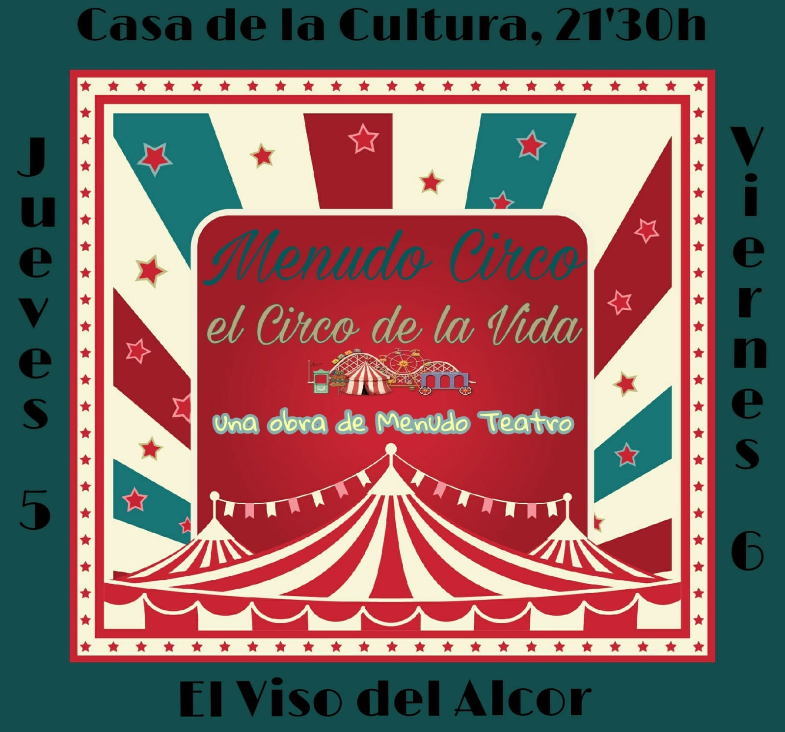 La Delegación de Cultura del Ayuntamiento organiza la representación teatral “Menudo circo, el circo de la vida” fruto del taller de teatro de personas adultas “Menudo Teatro” de la Delegación de Cultura del Ayuntamiento. Las representaciones serán el JUEVES 5 Y VIERNES 6 DE JULIO A LAS 21,30 H. EN LA CASA DE LA CULTURA. Entrada libre y gratuita hasta completar aforo.
