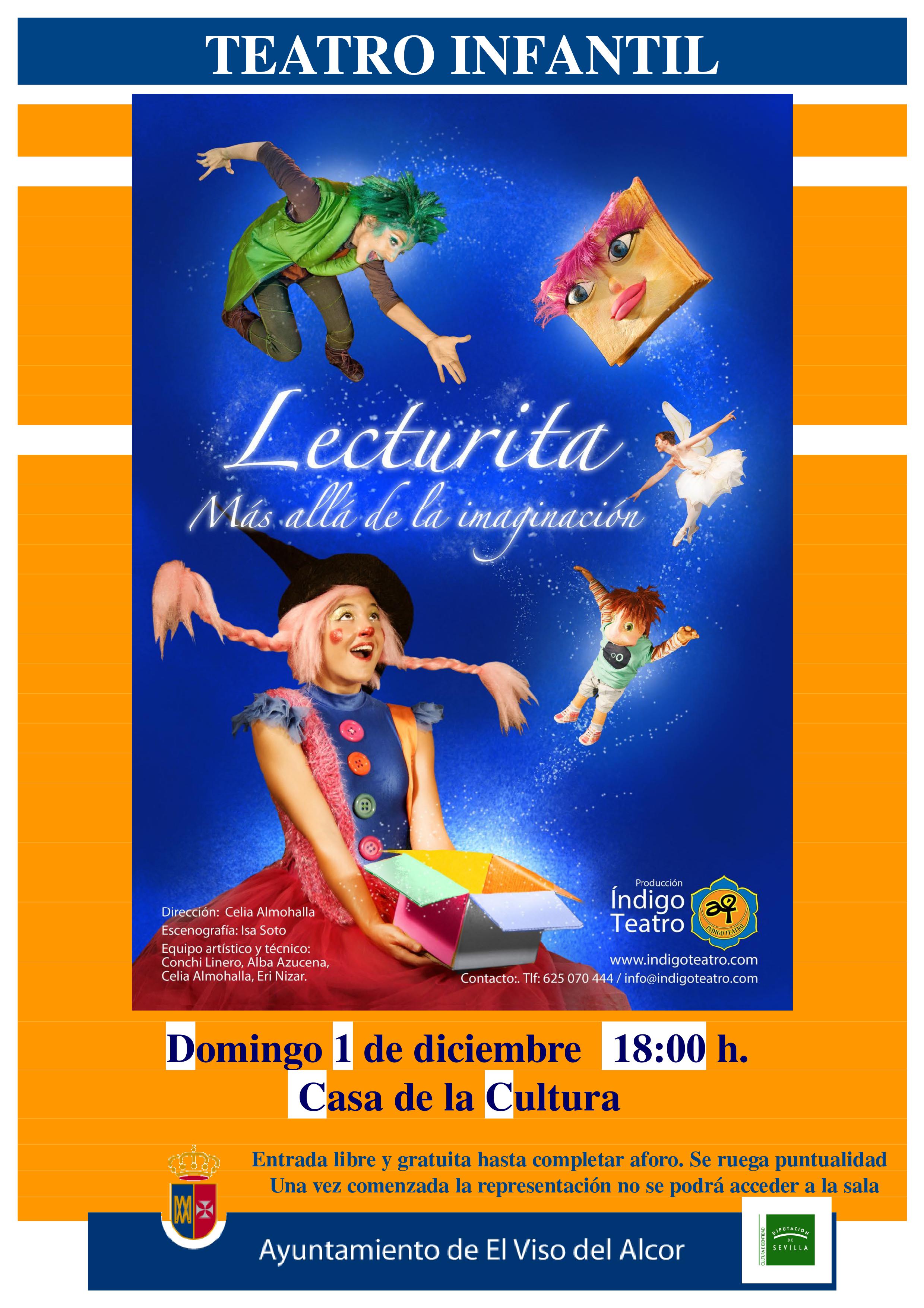La Delegación de Cultura del Ayuntamiento organiza la representación de la obra infantil “Lecturita, más allá de la imaginación” del grupo Índigo Teatro. Será el DOMINGO 1 DE DICIEMBRE A LAS 18:00 H. EN LA CASA DE LA CULTURA, dirigida principalmente al público infantil (3-10 años)