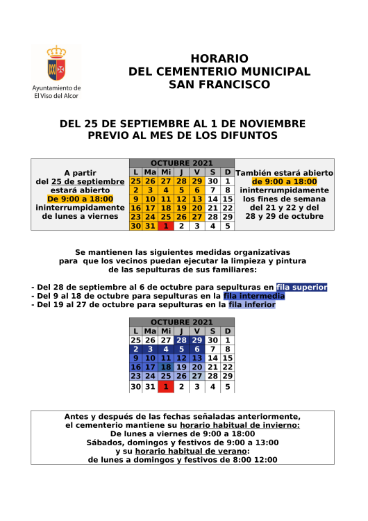 El Ayuntamiento de El Viso del Alcor, a través de la Delegación de Mantenimiento de Infraestructuras, se encuentra trabajando en el Cementerio Municipal “San Francisco”. El Alcalde de El Viso del Alcor, Gabi Santos, declara que desde el Consistorio “estamos ya trabajando para preparar el camposanto para la visita de muchos vecinos y vecinas que acudirán en las próximas semanas al lugar para limpiar y acondicionar las sepulturas donde descansan sus familiares”.