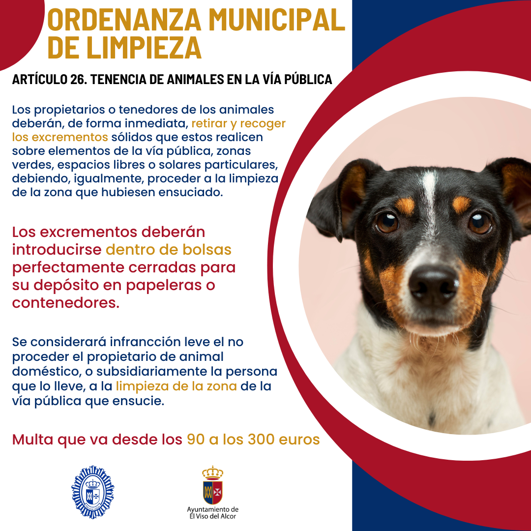 Concretamente, tanto el Delegado como el Jefe de Policía de El Viso del Alcor, Alfonso Borreguero, explican que la recogida de los excrementos de los perros y la limpieza de la zona que ensucien en la vía pública es de obligado cumplimiento por parte de la persona propietaria. Además, se recuerda que no cumplir con el Artículo 26 sobre Tenencia de animales en la vía pública puede acarrear una multa que va desde los 90 a los 300 euros.