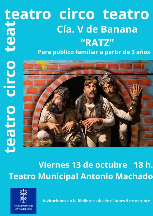 El Ayuntamiento de El Viso del Alcor, a través de la Delegación de Cultura, anuncia que el viernes 13 de octubre tendrá lugar una obra de teatro infantil en el Teatro Municipal “Antonio Machado” a las 18:00 horas. El Delegado de Cultura, Francisco José Soto, declara que las invitaciones para asistir a la obra “Ratz”, de la compañía Cía. V de Banana, se podrán recoger a partir del lunes 9 de octubre. Se podrán recoger un máximo de 3 invitaciones por persona hasta agotar existencias en la Biblioteca Municipal. Las invitaciones deberán ser retiradas por un adulto y no se hacen reservas telefónicas.