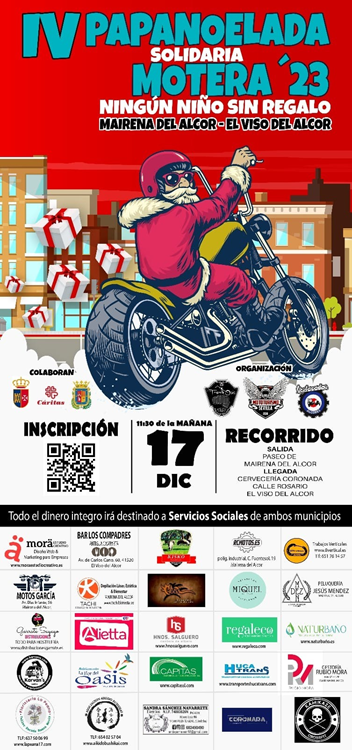 El Ayuntamiento de El Viso del Alcor, a través de la Delegación de Servicios Sociales, anuncia que la Papanoelada Motera solidaria volverá a las calles de El Viso del Alcor el próximo 17 de diciembre. La Delegada de Servicios Sociales, Gracia Miranda, detalla que se trata de la cuarta edición de esta iniciativa solidaria del que participan grupos moteros de Los Alcores, el cual tiene por objetivo recaudar fondos que irán integramente destinados a Cáritas Parroquial.